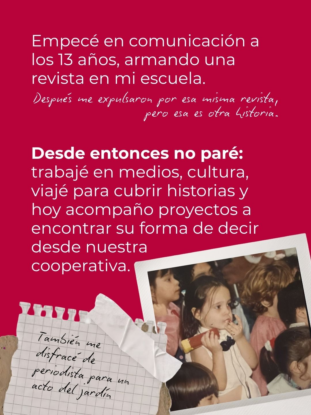 A los 13 años armé una revista en mi escuela y desde entonces no dejé nunca de comunicar. A los 19 dejé un trabajo administrativo para convertirme en road manager de un sello discográfico, así que mi primera etapa estuvo muy ligada a la producción cultural: trabajé en la comunicación de festivales, bandas de música y eventos artísticos, siempre muy enfocada en la difusión y en la coordinación de equipos.